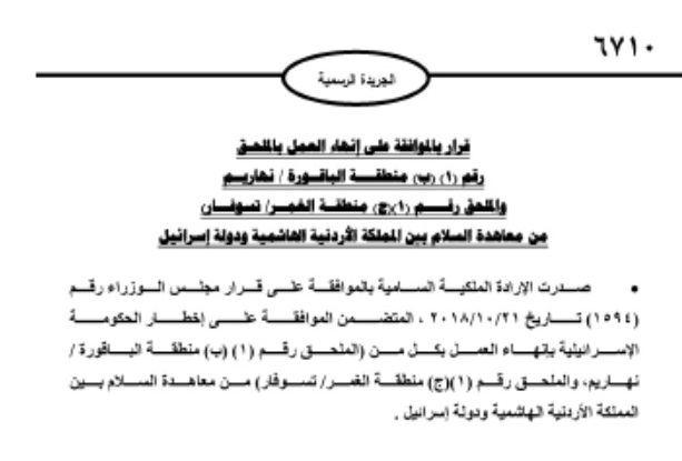صدرت في الجريدة الرسمية، الإرادة الملكية الخميس، بالموافقة قرار مجلس الوزراء القاضي بإخطار الجانب الإسرائيلي بإنهاء الملحقين المتعلقين بأراضي منطقتي الباقورة والغمر في معاهدة السلام بين الجانبين.