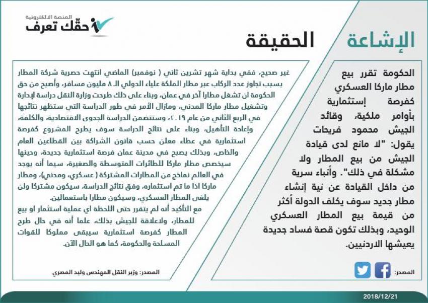 كما قالت منصة "حقك تعرف" انتهت حصرية شركة المطار بسبب تجاوز عدد ركاب مطار الملكة علياء الـ 8 مليون مسافر، واصبح من حق الحكومة ان تشغل مطارا آخر في عمان.