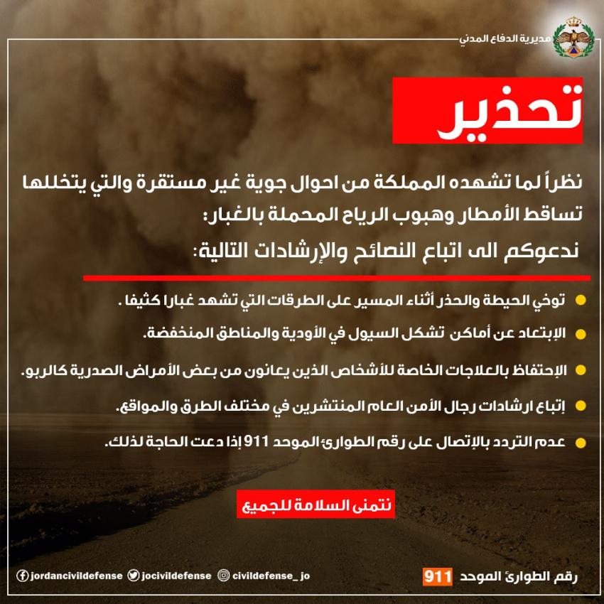أكدت إدارة الدفاع المدني، ضرورة توخي الحيطة والحذر اثناء المسير على الطرقات، نظرًا لما تشهده المملكة من أحوال جوية غير مستقرة والتي يتخللها تساقط مطري وهبوب الرياح المحملة بالغبار.