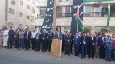 ودان المشاركون في الوقفة مشاركة الأردن ودول عربية في ورشة البحرين، معتبرين ذلك "عدواناً صارخاً على القضية الفلسطينية ومساساً بثوابتها التاريخية الراسخة".