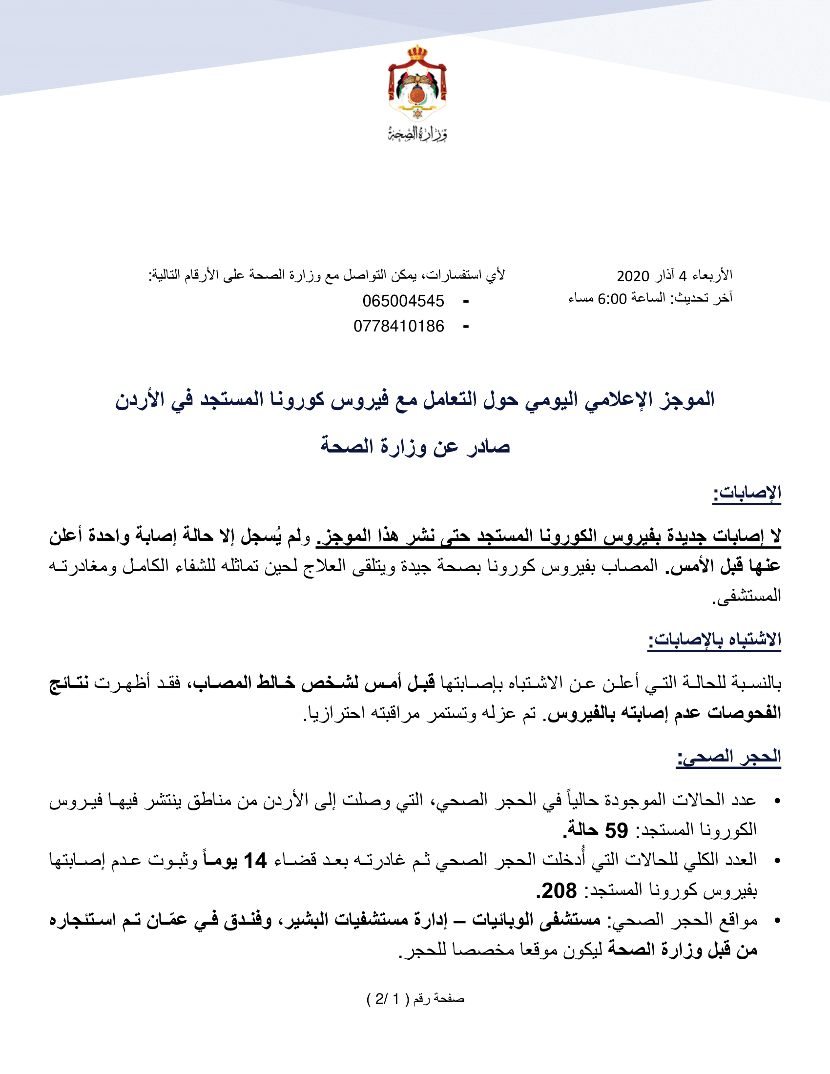 حيث بينت الوزارة أنها لم تسجل اي إصابة جديدة بالكورنا في حين تتواجد 59 حالة بالحجر الطبي.