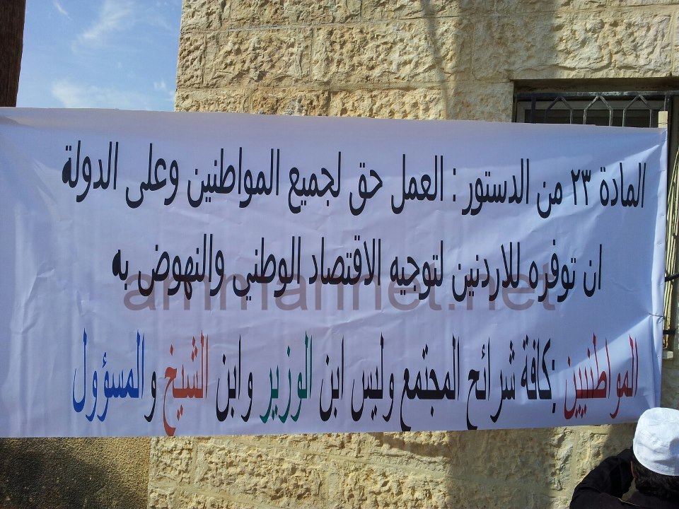 وقالوا " لعمان نت" سكان معان اولى بالعمل داخل مشاريع المقامة في المحافظة، مؤكدين ان الاعتصام ستواصل حتى تحقيق المطالب ليتحول الى اعتصام مفتوح.