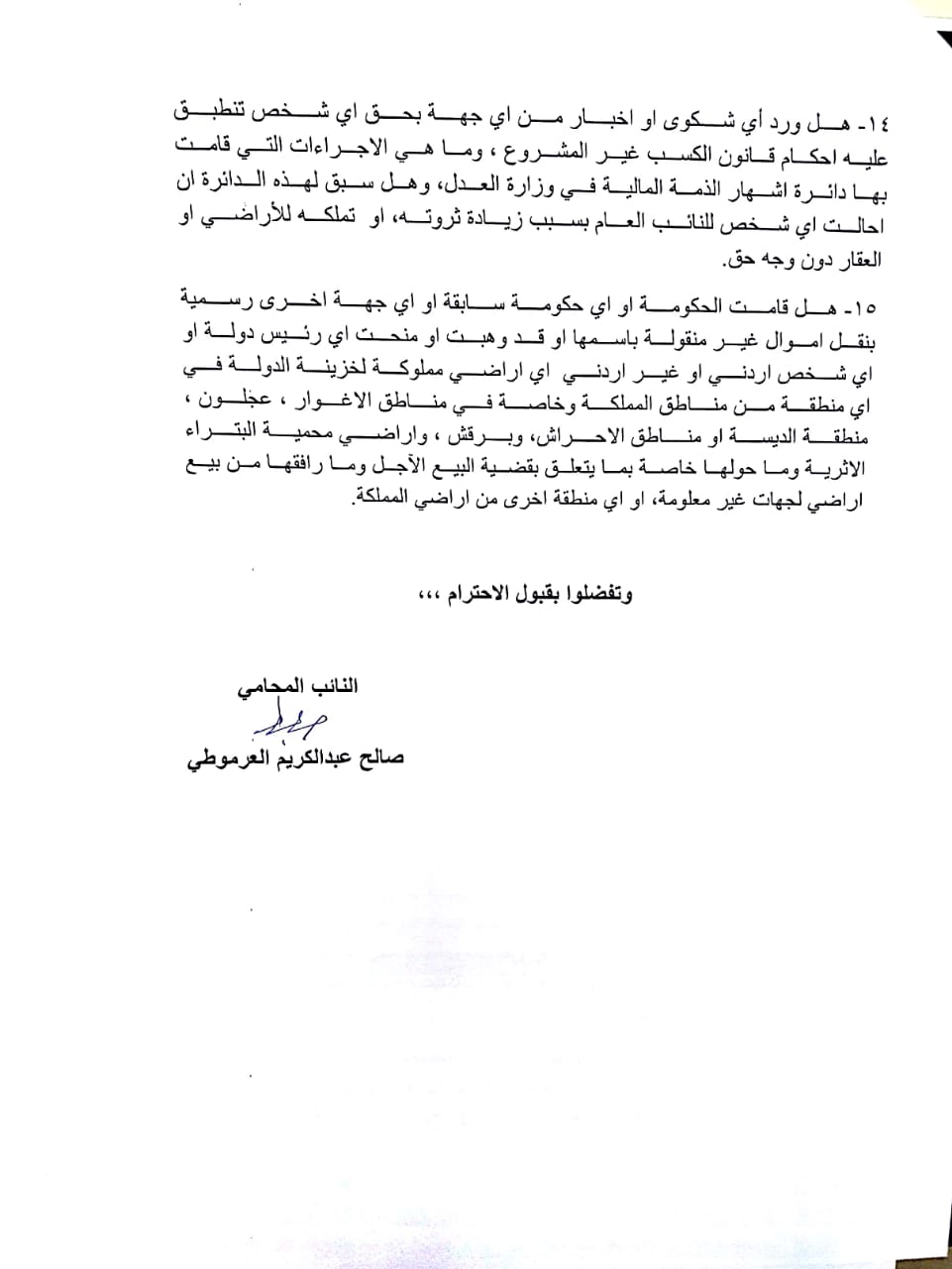 15- هل قامت الحكومة او اي حكومة سابقة او اي جهة اخرى رسمية بنقل اموال غير منقولة باسمها او قد وهبت او منحت اي رئيس دولة او اي شخص اردني او غير اردني اي اراضي مملوكة لخزينة الدولة في اي منطقة من مناطق المملكة وخاصة في مناطق الاغوار ، عجلون ، منطقة الديسة او مناطق الاحراش، وبرقش ، واراضي محمية البتراء الاثرية وما حولها خاصة بما يتعلق بقضية البيع الآجل وما رافقها من بيع اراضي لجهات غير معلومة، او اي منطقة اخرى من اراضي المملكة.