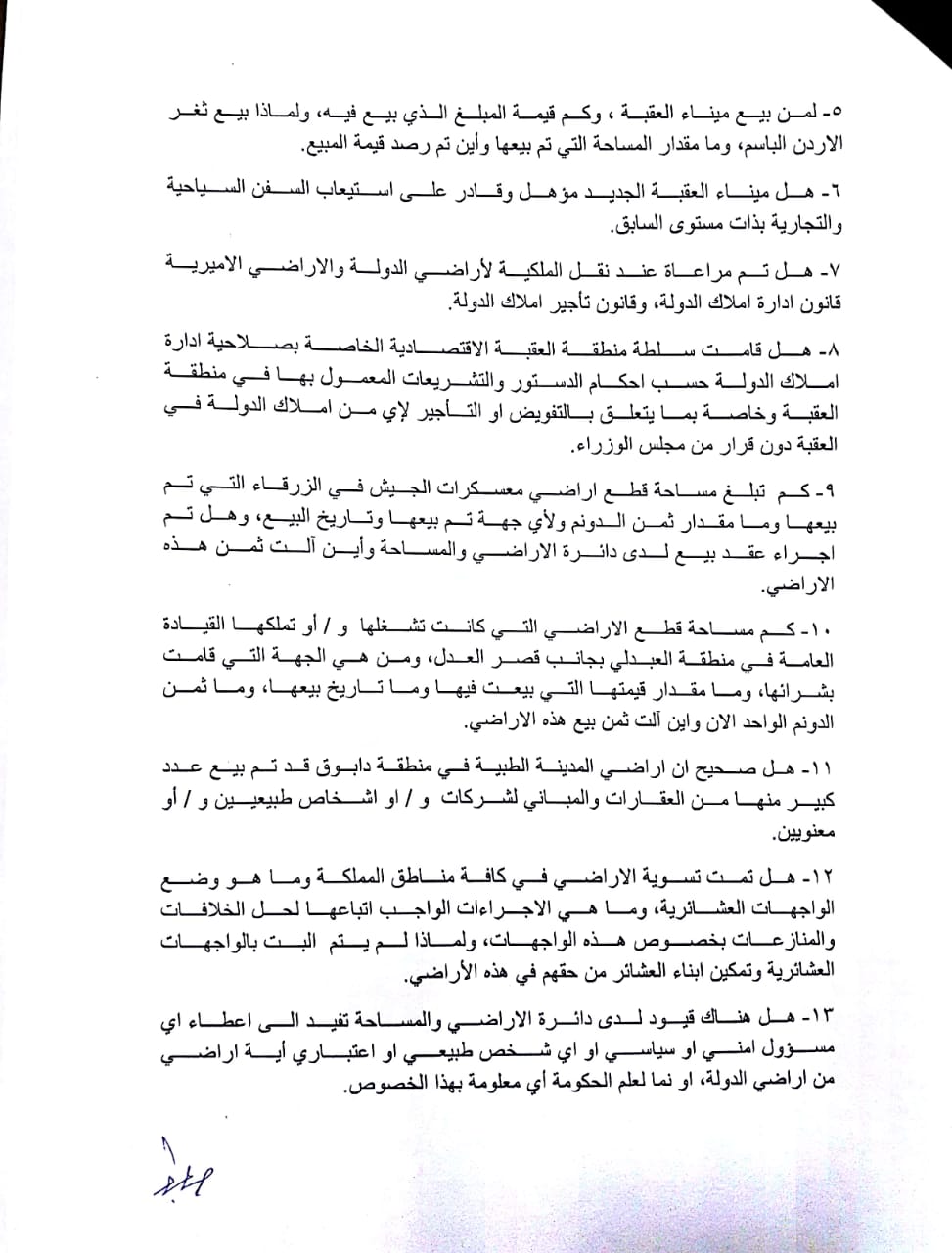5- لمن بيع ميناء العقبة ، وكم قيمة المبلغ الذي بيع فيه، ولماذا بيع ثغر الاردن الباسم، وما مقدار المساحة التي تم بيعها وأين تم رصد قيمة المبيع.