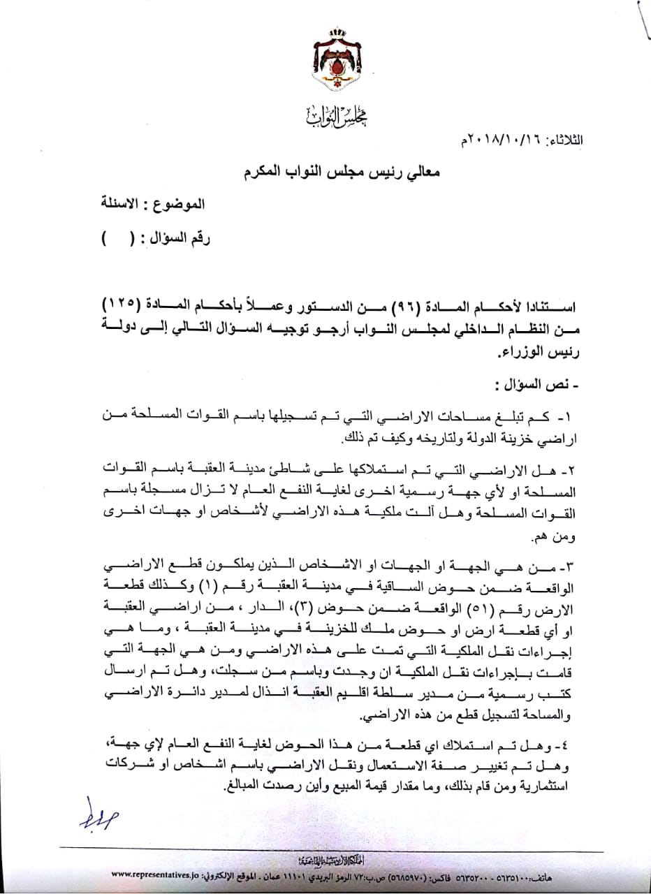 وجه النائب صالح العرموطي سؤالأ إلى رئيس الوزراء الدكتور عمر الرزاز حول مساحات الاراضي التي تم تسجيلها باسم القوات المسلحة من اراضي خزينة الدولة.