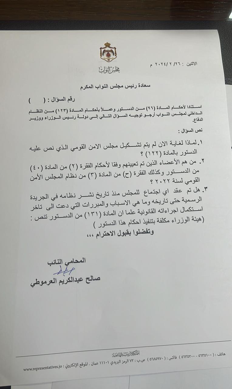 وجه النائب صالح العرموطي سؤالًا نيابيًا إلى رئيس الوزراء ووزير الدفاع بشأن سبب عدم تشكيل مجلس الأمن القومي حتى الآن، وعن الأعضاء الذين تم تعيينهم فيه.