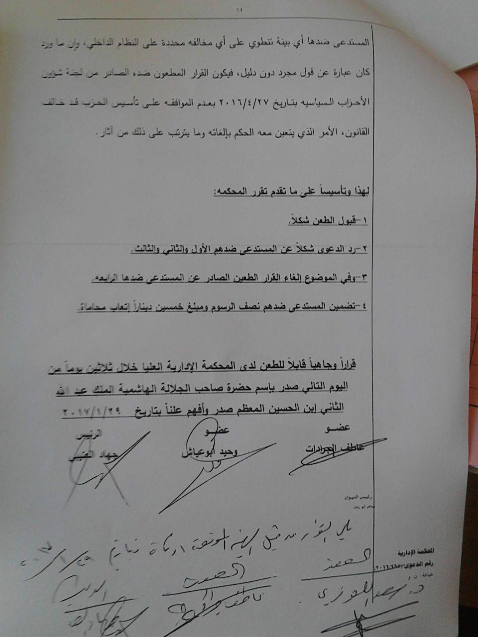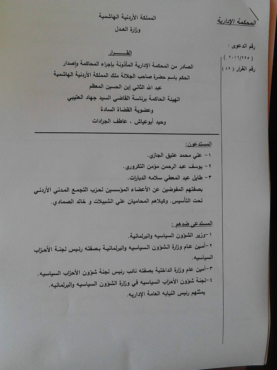 ردت المحكمة الادارية العليا الأحد قرار وزارة التنمية السياسية بعدم ترخيص حزب التجمع الوطني الأردني.