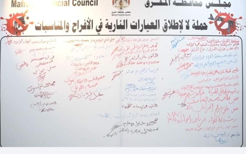 وأعلن من خلاله وجهاء وشيوخ عشائرية في المحافظة تنفيذهم الفوري لتوجيهات الملك الرامية إلى عدم إطلاق العيارات النارية في الافراح والمناسبات، وتكثيف الحملات الأمنية لملاحقة من يحوزون السلاح بطريقة غير شرعية من خلال محافظ المفرق ومديرية الشرطة فيها .