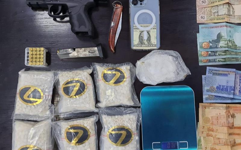 وفي محافظة العقبة وبعد جمع المعلومات ومتابعة احد تجار المخدرات ممن يقومون بتزويد المروجين بتلك المواد ، والتأكد من حيازته لكميات كبيرة من المخدرات جرت مداهمة منزله والقاء القبض عليه وضبط بحوزته 700 غم من مادة الكوكايين و 10 آلاف حبة مخدرة و 1 كغم من مادة الحشيش وسلاح ناري .