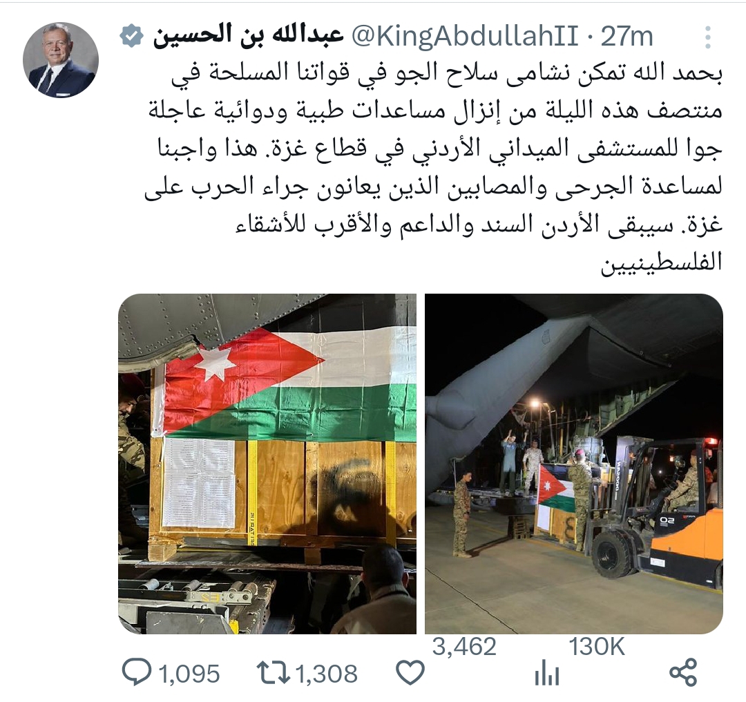 بحمد الله تمكن نشامى سلاح الجو في قواتنا المسلحة في منتصف هذه الليلة من إنزال مساعدات طبية ودوائية عاجلة جوا للمستشفى الميداني الأردني في قطاع غزة. هذا واجبنا لمساعدة الجرحى والمصابين الذين يعانون جراء الحرب على غزة. سيبقى الأردن السند والداعم والأقرب للأشقاء الفلسطينيين