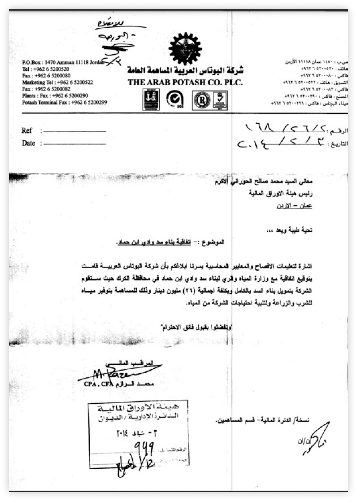 قدّمت شركة البوتاس العربية منحة للحكومة الأردنية لإنشاء سد في وادي ابن حماد في الأغوار الجنوبية، عام 2014. موّلت الشركة إنشاء السد بقيمة 26 مليون دينار أردني، مقابل تزويدها بنحو 2.5 مليون متر مكعب سنوياً من المياه؛ أي ما يعادل نحو 63 في المئة من السعة القصوى للسد سنوياً، وبسعر تفضيلي يبلغ ربع السعر الممنوح إلى القطاع الصناعي، ضمن ما عرف باتفاقية (التمويل مقابل المياه).