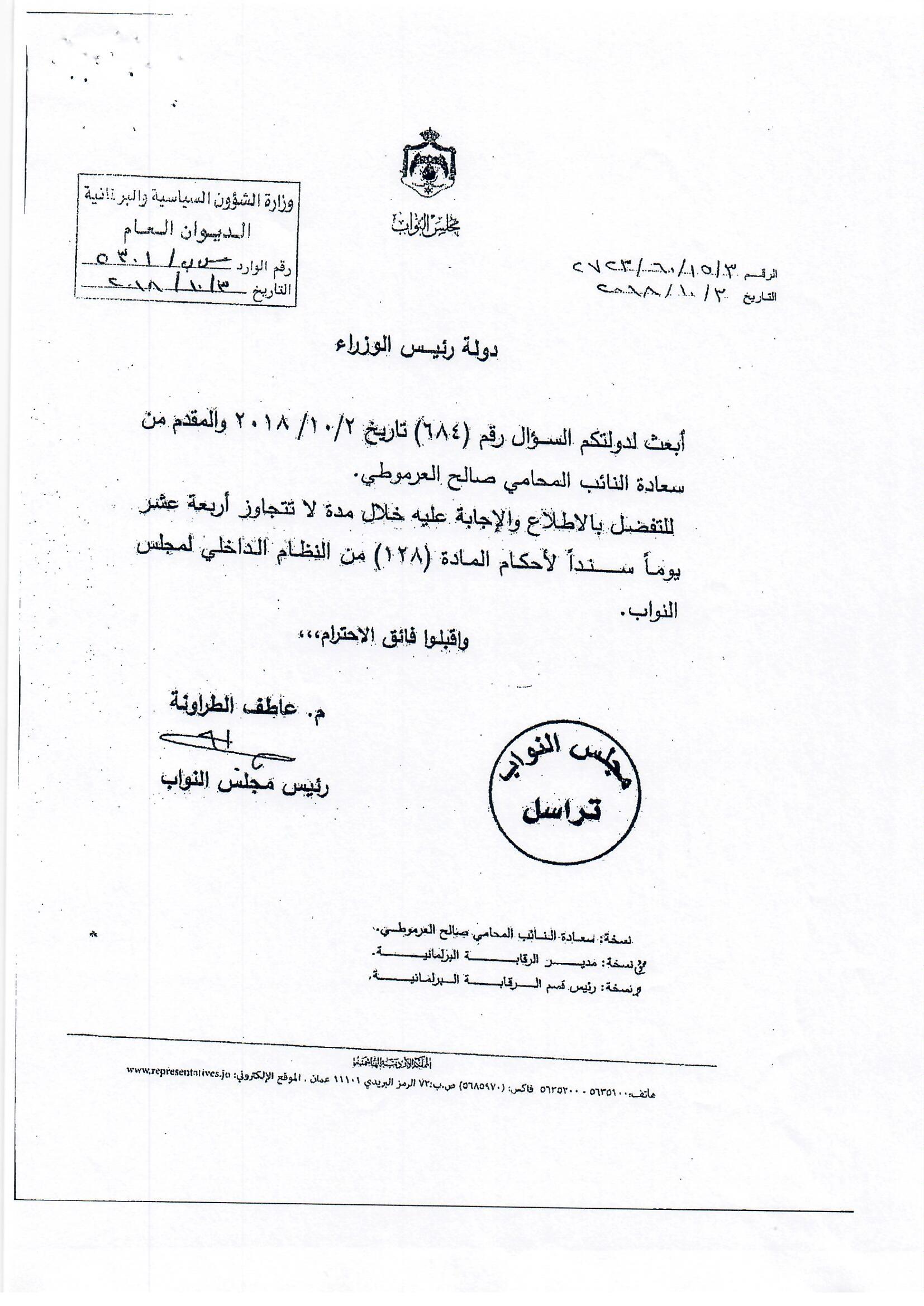 قال النائب صالح العرموطي اليوم الاثنين ، أنه وصله جواب على سؤاله الذي وجهه بتاريخ 3/10/2018 لرئيس الوزراء بخصوص أكاديمية الملكة رانيا .