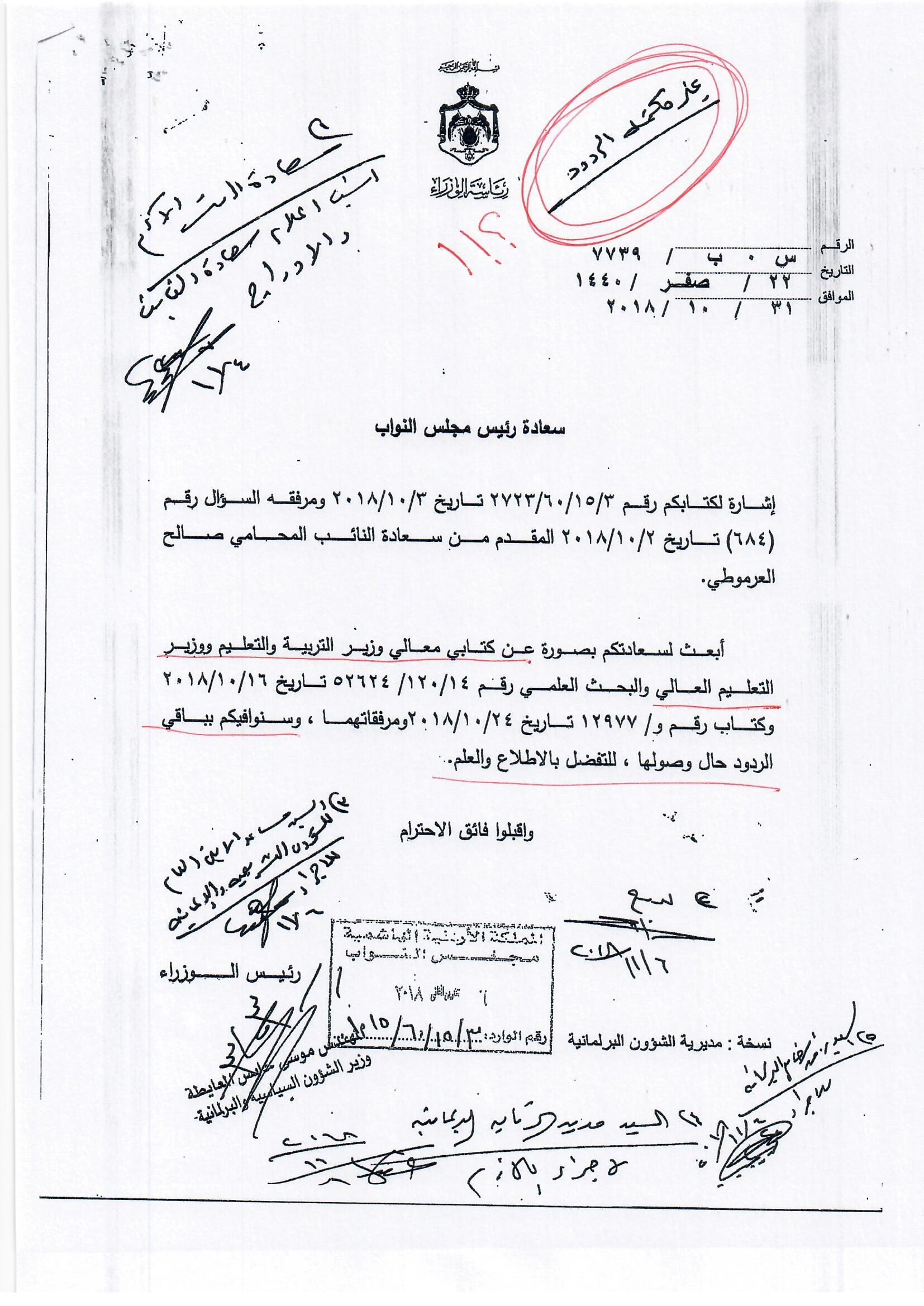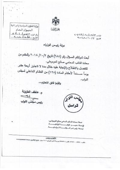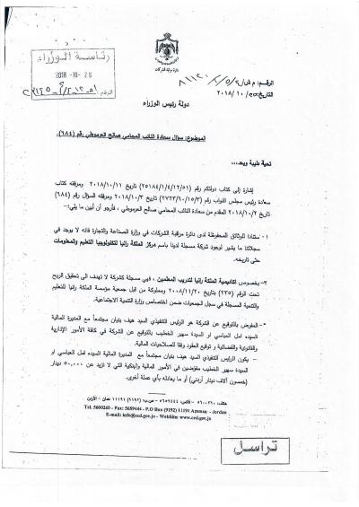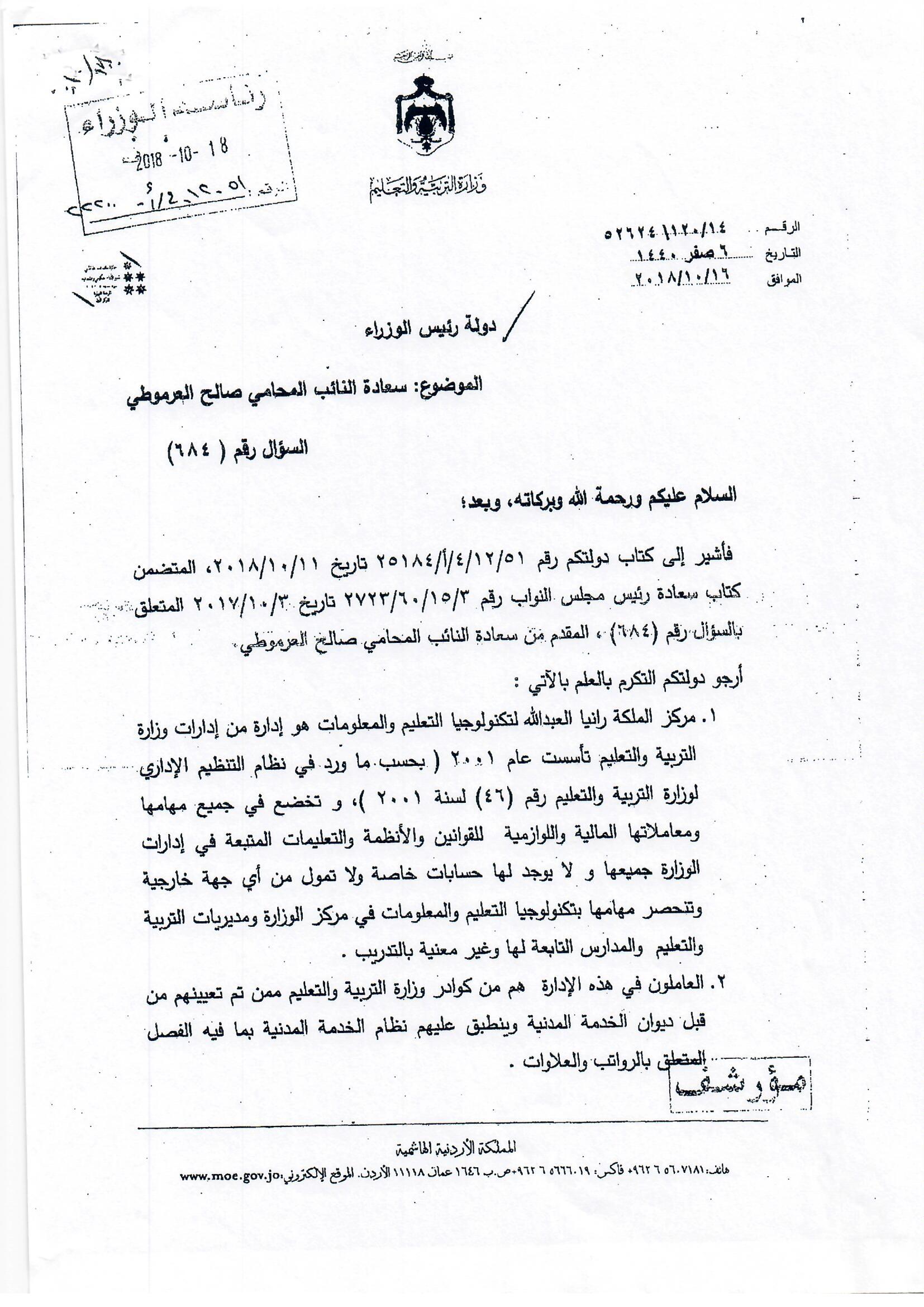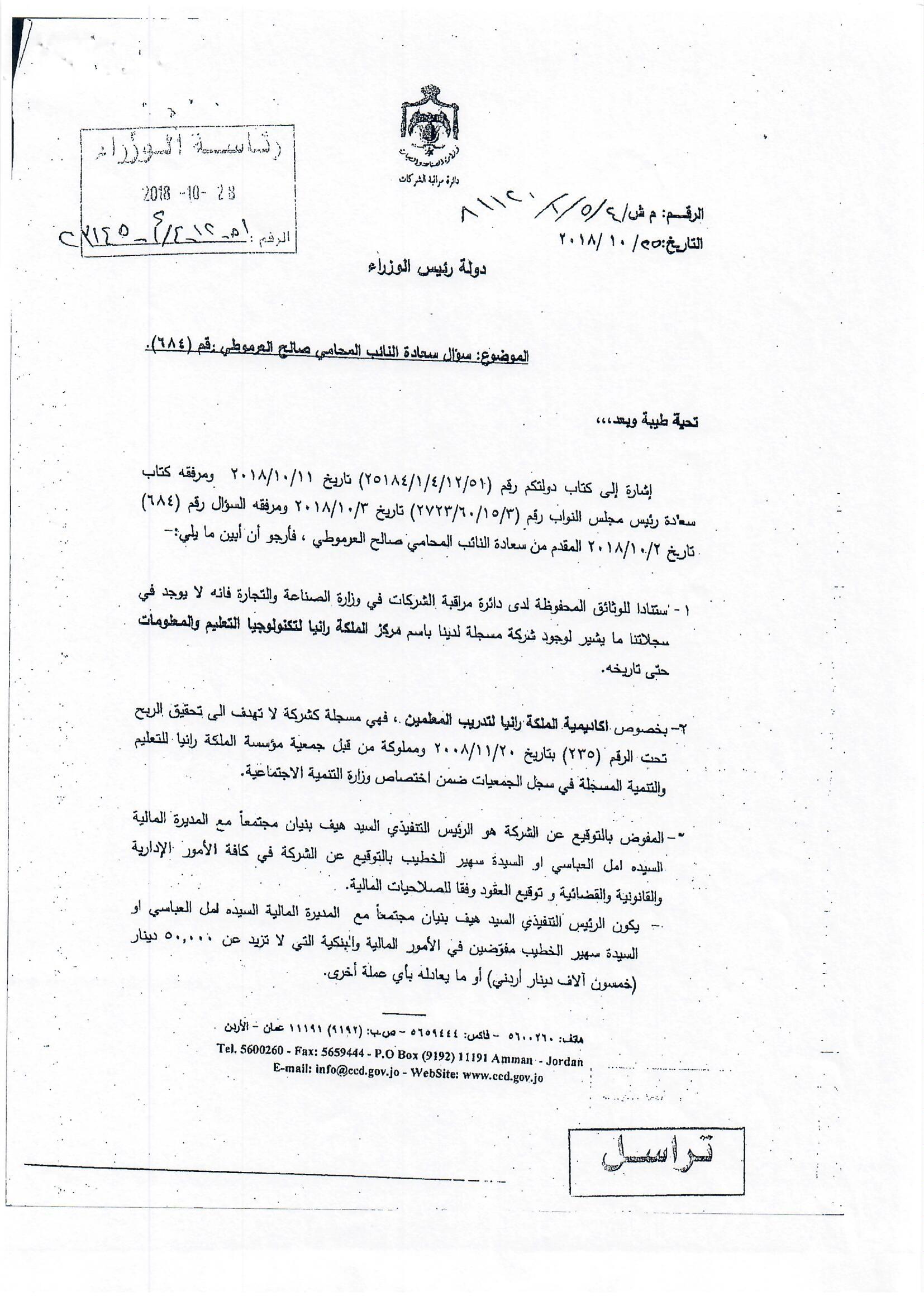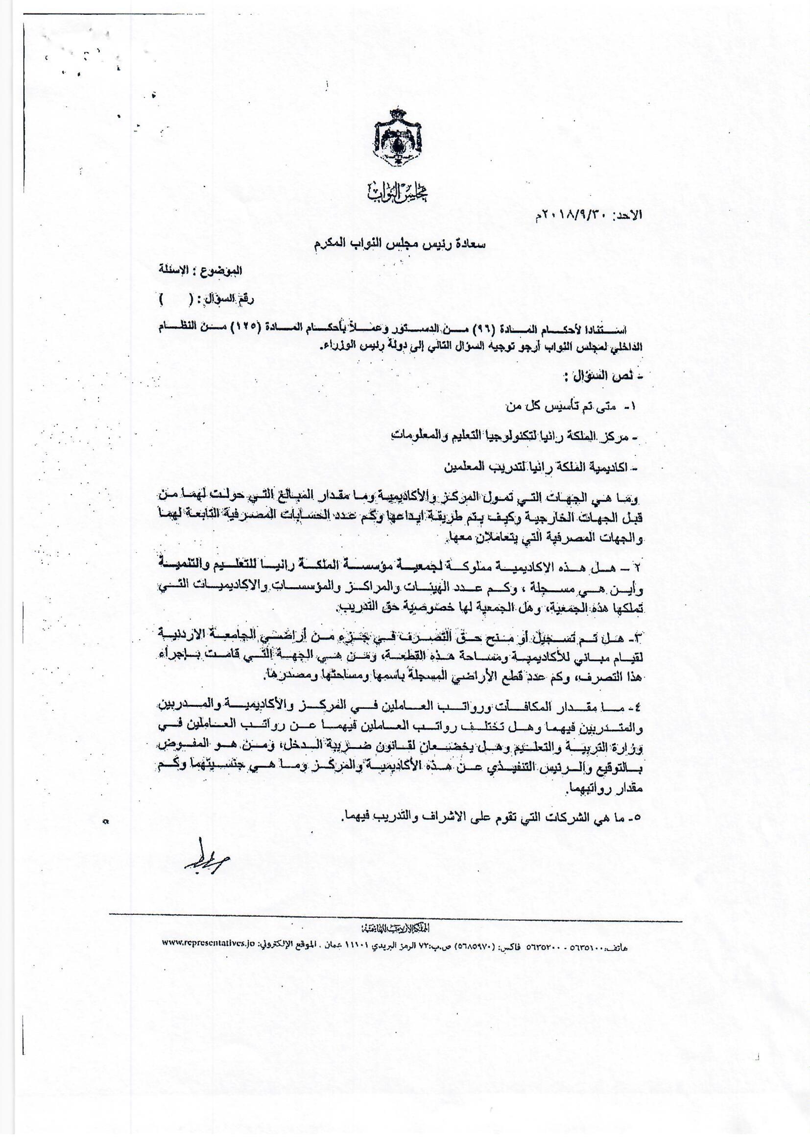 هذا الجواب الذي وردني على سؤالي الذي وجهته بتاريخ 3/10/2018 لرئيس الوزراء بخصوص أكاديمية الملكة رانيا، إلا أنه جاء غير مكتمل، وفي كل رد أرسلته الحكومة أوردت عبارة (( وسنوافيكم بباقي الردود حال وصولها ))، وما وصلني هو الرد الوارد من وزيري التربية والتعليم والصناعة والتجارة، فيما لم يرد أي رد من وزير المالية رغم خطاب رئيس الوزراء له، علما أن رواد الفضاء صعدوا إلى القمر وعادوا خلال 12 يوما ....