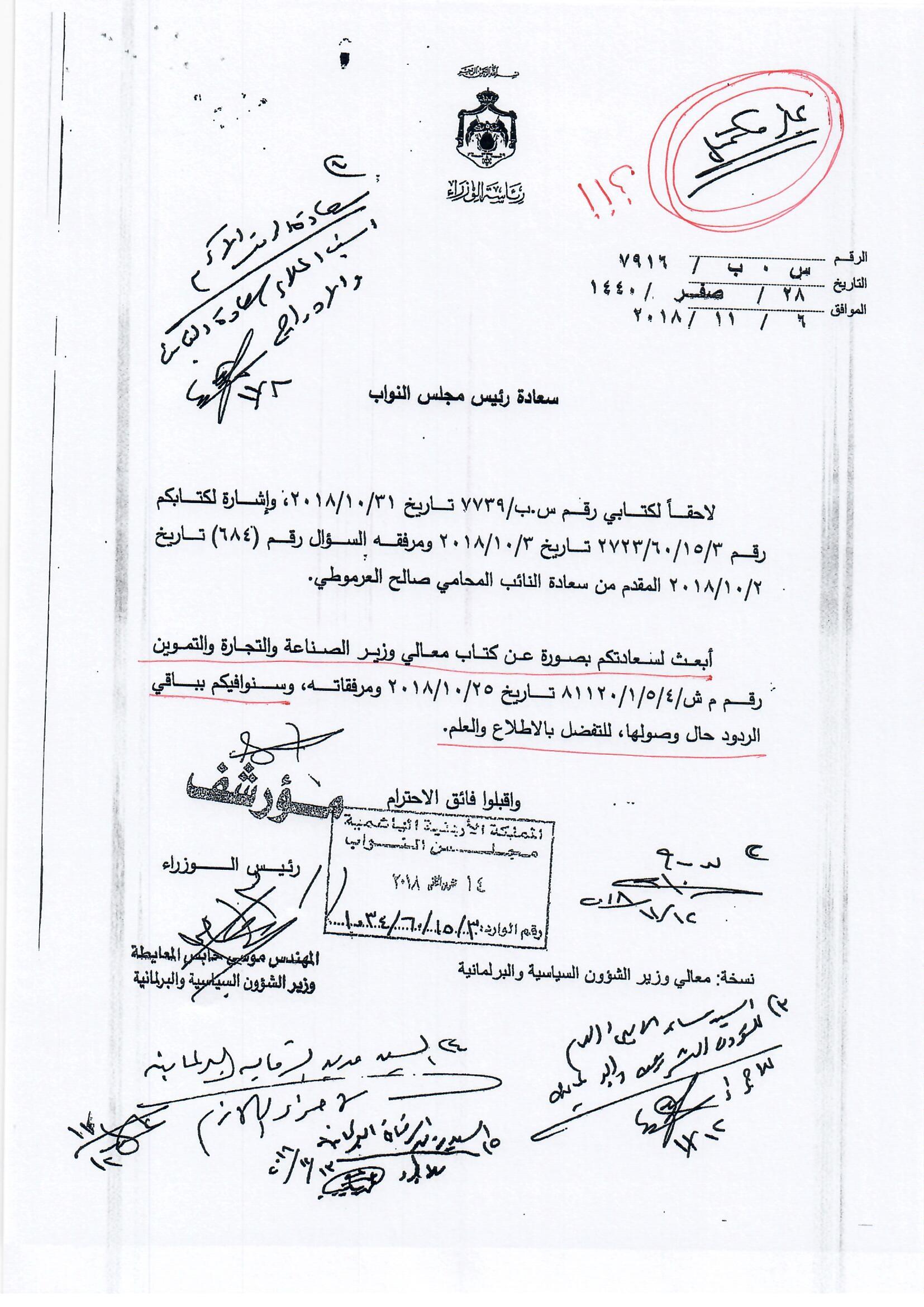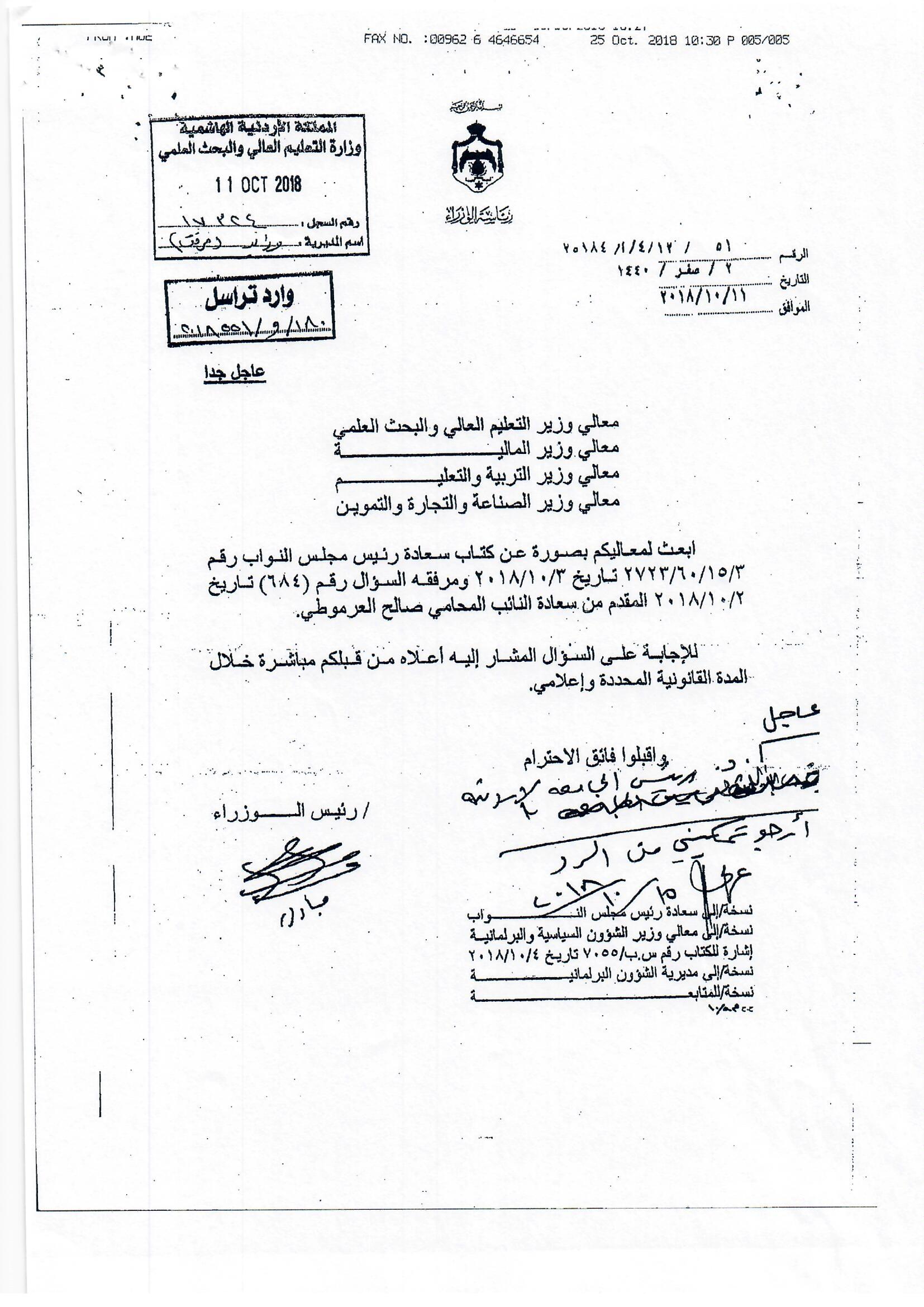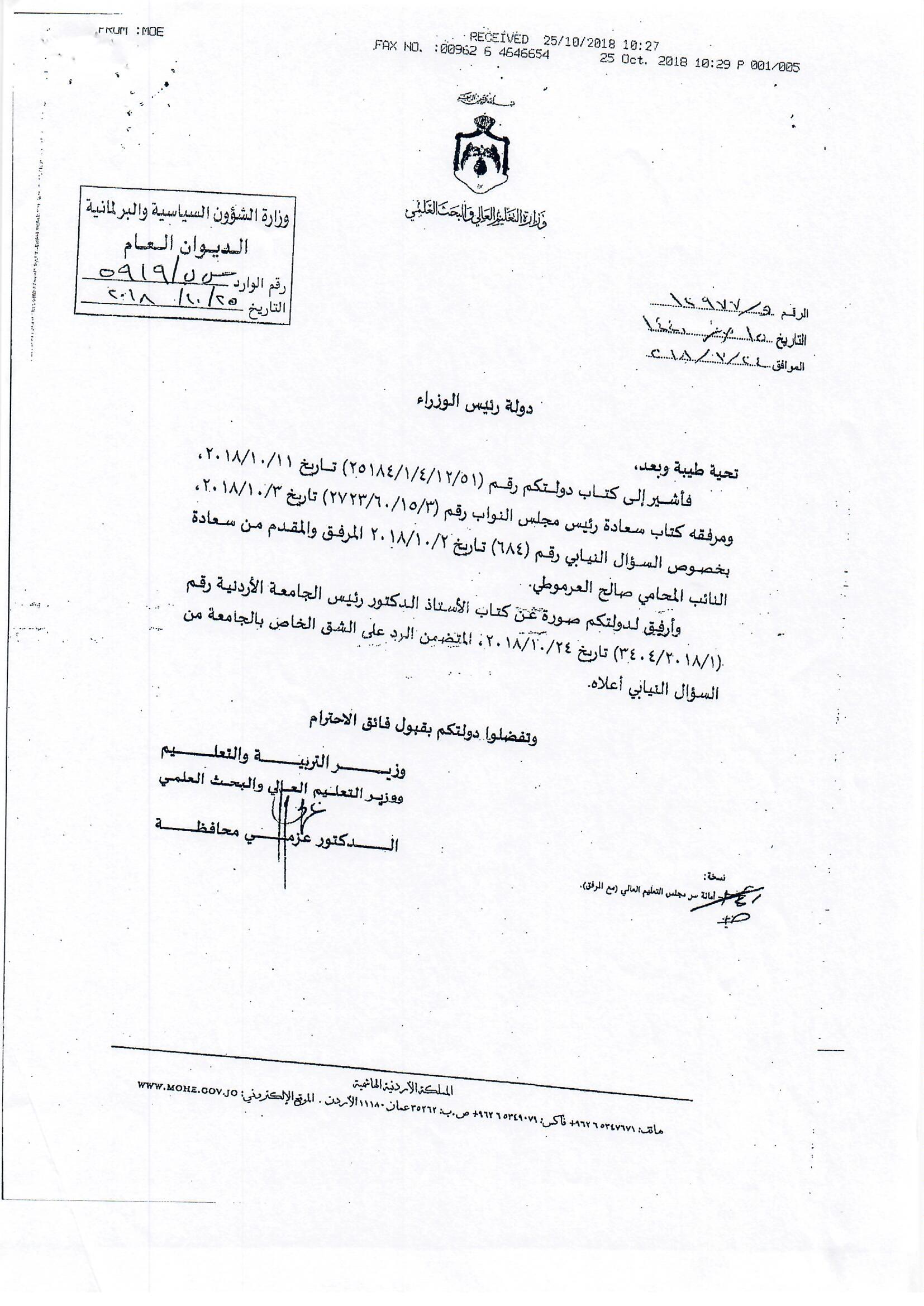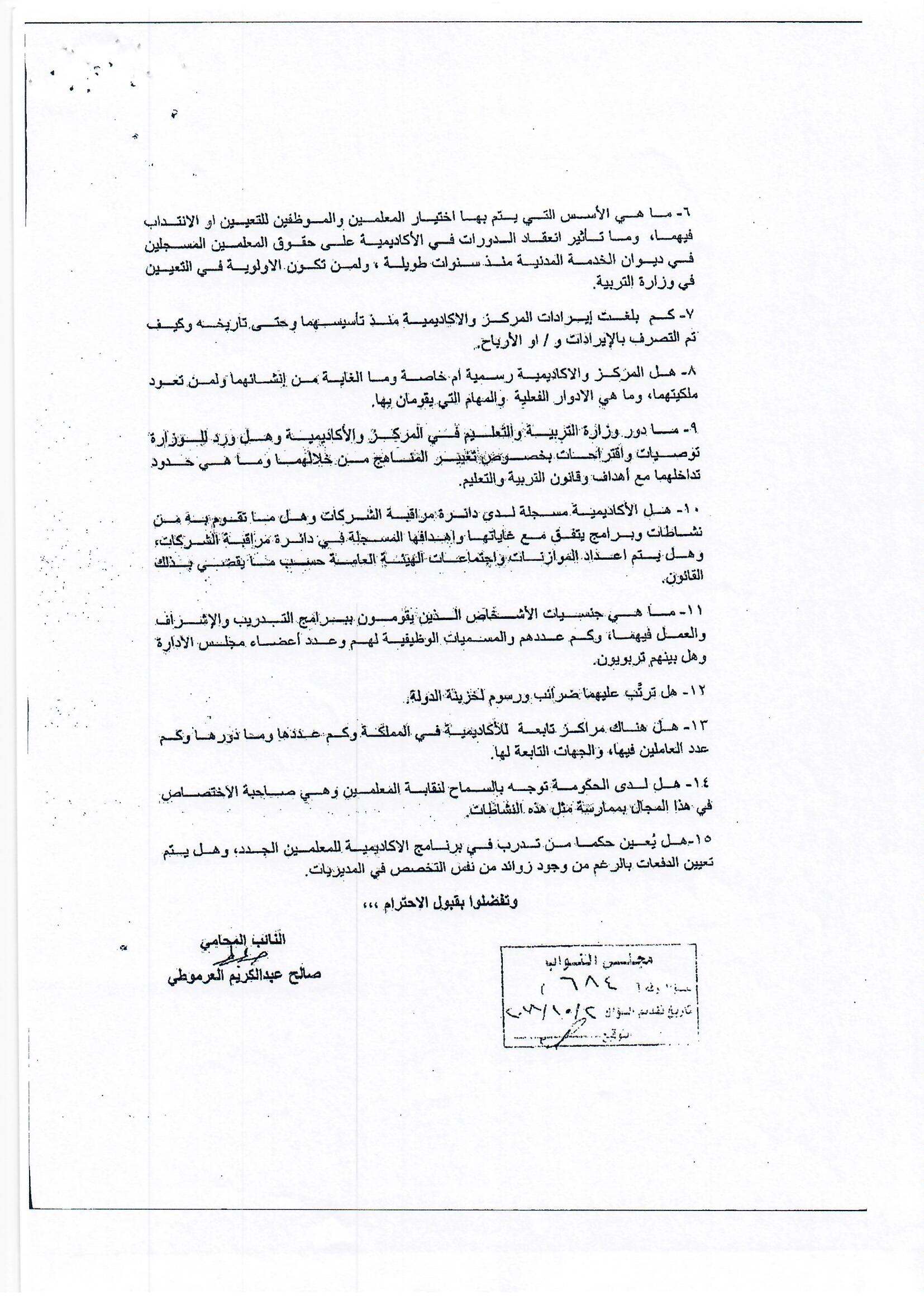 هذا الجواب الذي وردني على سؤالي الذي وجهته بتاريخ 3/10/2018 لرئيس الوزراء بخصوص أكاديمية الملكة رانيا، إلا أنه جاء غير مكتمل، وفي كل رد أرسلته الحكومة أوردت عبارة (( وسنوافيكم بباقي الردود حال وصولها ))، وما وصلني هو الرد الوارد من وزيري التربية والتعليم والصناعة والتجارة، فيما لم يرد أي رد من وزير المالية رغم خطاب رئيس الوزراء له، علما أن رواد الفضاء صعدوا إلى القمر وعادوا خلال 12 يوما ....
