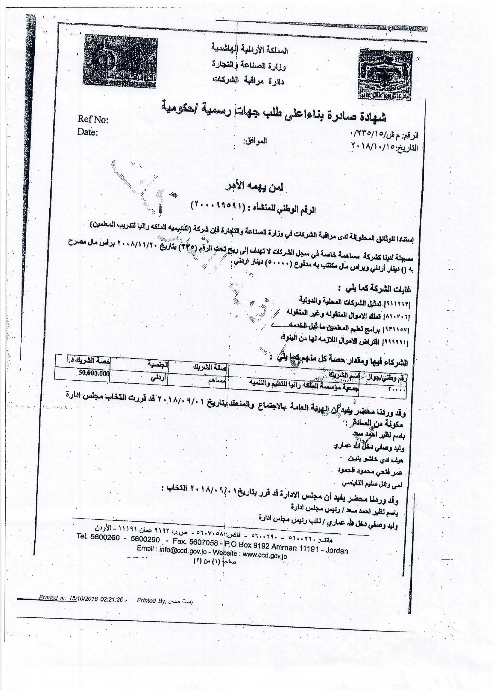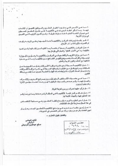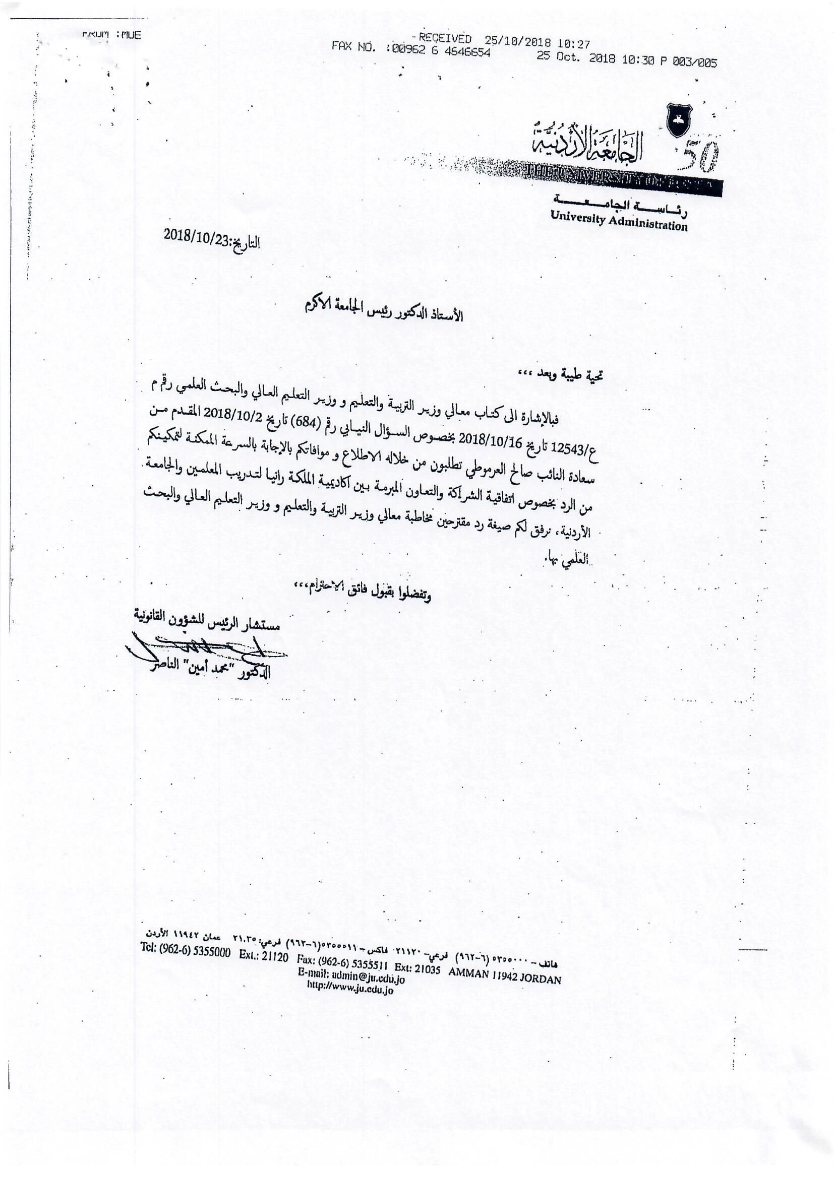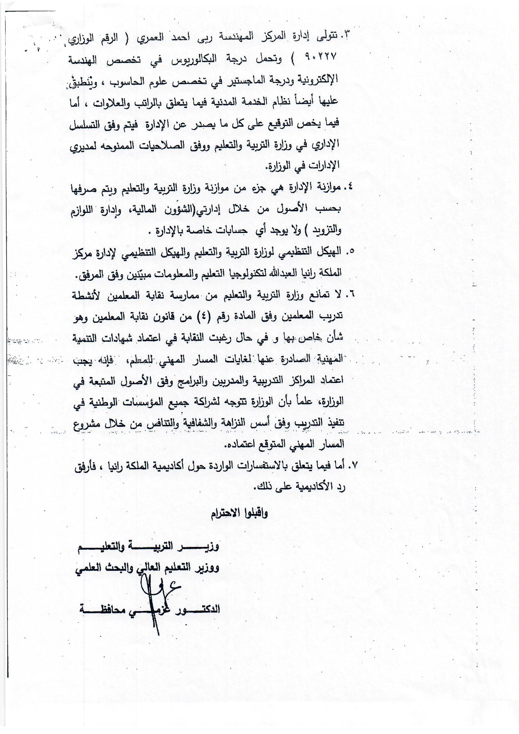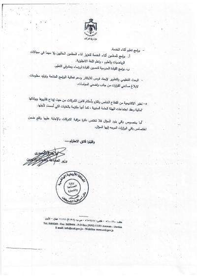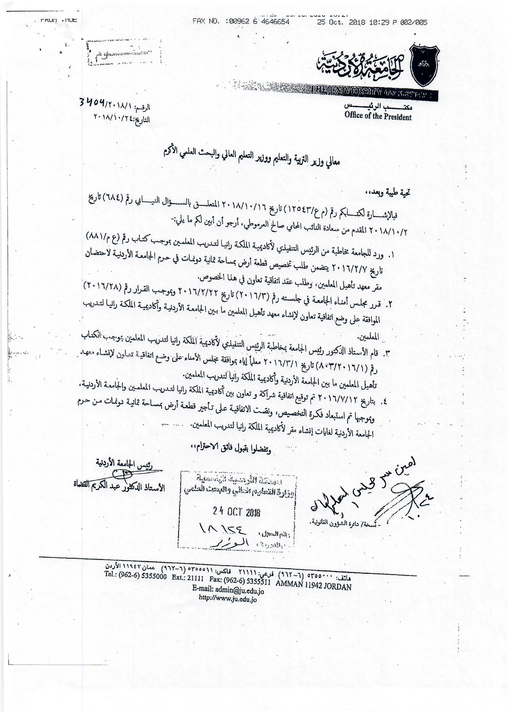 هذا الجواب الذي وردني على سؤالي الذي وجهته بتاريخ 3/10/2018 لرئيس الوزراء بخصوص أكاديمية الملكة رانيا، إلا أنه جاء غير مكتمل، وفي كل رد أرسلته الحكومة أوردت عبارة (( وسنوافيكم بباقي الردود حال وصولها ))، وما وصلني هو الرد الوارد من وزيري التربية والتعليم والصناعة والتجارة، فيما لم يرد أي رد من وزير المالية رغم خطاب رئيس الوزراء له، علما أن رواد الفضاء صعدوا إلى القمر وعادوا خلال 12 يوما ....