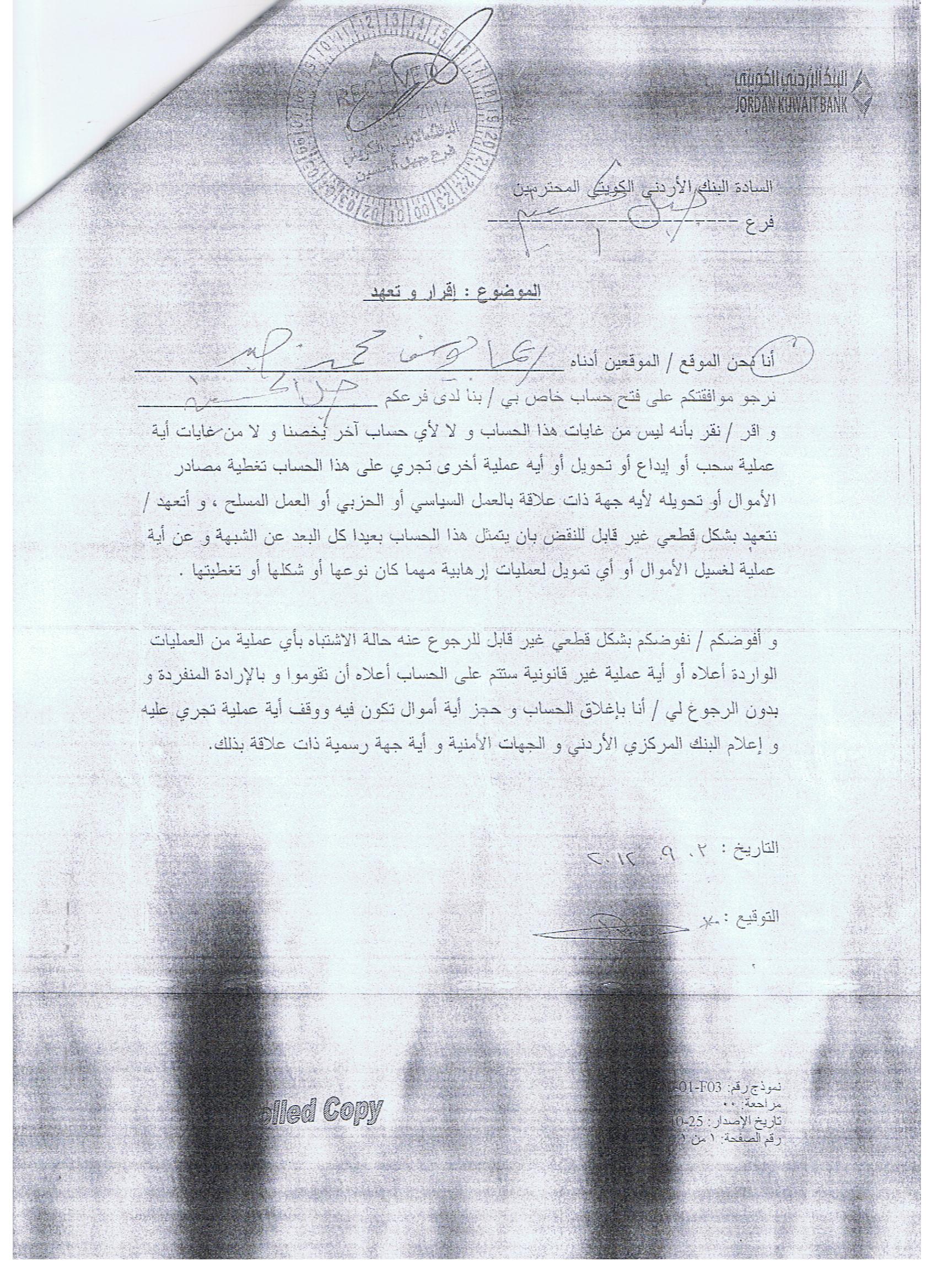 لكن ريما تظهر وثيقة أخرى ألزمت على توقيعها وهي نموذج إقرار وتعهد يفيد بأن ليس من غايات حسابها تحويله أو الاستفادة منه لصالح حزب أو أي عمل له علاقة بالعمل السياسي أو الحزبي أو العمل المسلح أو غسيل أموال أو أي تمويل لعمليات إرهابية.
