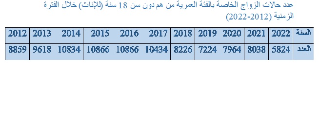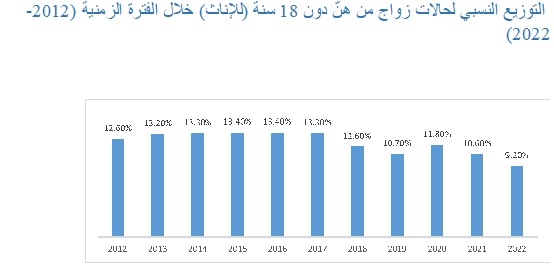حيث كان الانخفاض بنسبة 27.5% عن عام 2021 وبعدد 2213 حالة. إذ في عام 2021 كان عدد الحالات (8037) حالة، في حين سجل (5824) حالة فقط في عام 2022، وبلغت نسبة زواج القاصرات من عدد عقود الزواج لعام 2022 نحو 9%.