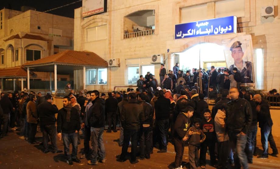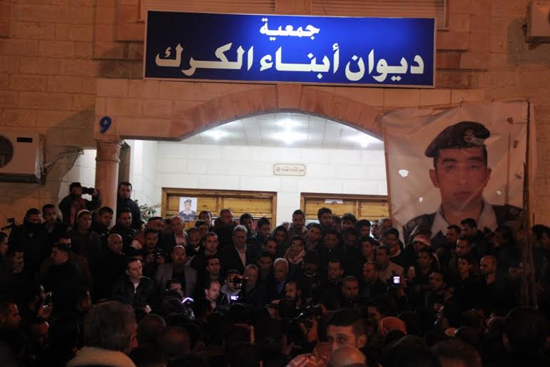 وشهدت محافظة الكرك احتجاجات شعبية فور إعلان نبأ استشهاد الطيار معاذ الكساسبة مساء الثلاثاء على يد تنظيم الدولة الإسلامية، فيما قام عشرات الشبان بإضرام النار في متصرفية عي مسقط رأس الشهيد.