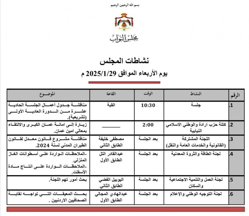 كما يناقش قــرار اللجنة الإدارية، المتضمن مشروع قانون معدل لقانون البناء الوطني الأردني لسنة 2024.