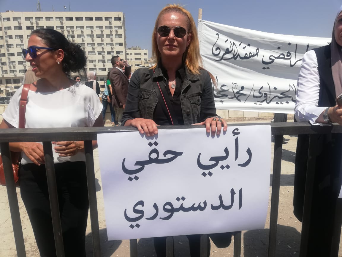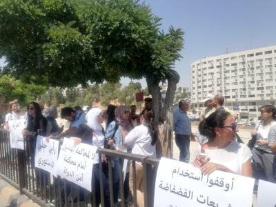 وحمل المعتصمون يافطات كتب عليها ،"أوقفوا استخدام المواد الفضفاضة ولا لمحاكمة المدنيين أمام محكمة أمن الدولة ، والحرية لمعتقلي الرأي " .
