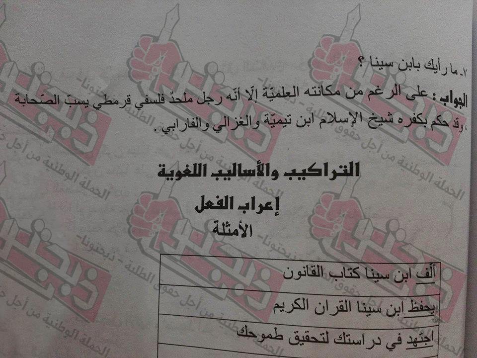 وفي التفاصيل، أشارت ذبحتونا إلى وجود "دوسية" لغة عربية لطلبة الصف الخامس تحمل اسم الوسيط، وتباع في المكتبات والأسواق، يجيب "المعلم" معدّ هذه الدوسية على سؤال ورد في درس ابن سينا في مادة اللغة العربية للصف الخامس بالتالي: