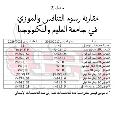 "وفقًا للقراءة التي أعدتها الحملة الوطنية من أجل حقوق الطلبة 'ذبحتونا'، يوضح الجدول رقم (4) التخصصات التقنية التي تقدمها الجامعة. ويبين الجدول أن تسعة تخصصات من أصل اثني عشر تخصصًا تقنيًا تبلغ رسومها للبرنامج التنافسي 80 دينارًا، بينما تتراوح رسوم البرنامج الموازي لهذه التخصصات ما بين 100-110 دينارًا لطلبة (توجيهي أردني)، ، وبين 120-130 دينارًا لطلبة (توجيهي غير أردني)،.