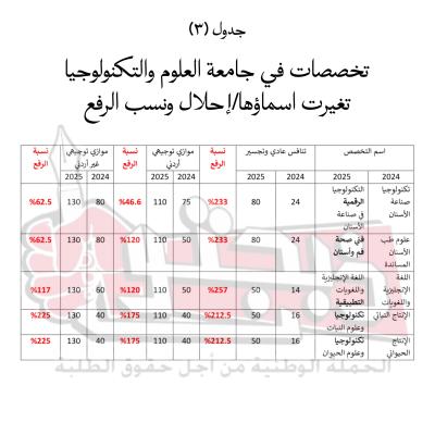 هذا وستصدر الحملة قراءة تفصيلية لاحقة حول التخصصات التقنية في الجامعات الرسمية والخاصة."