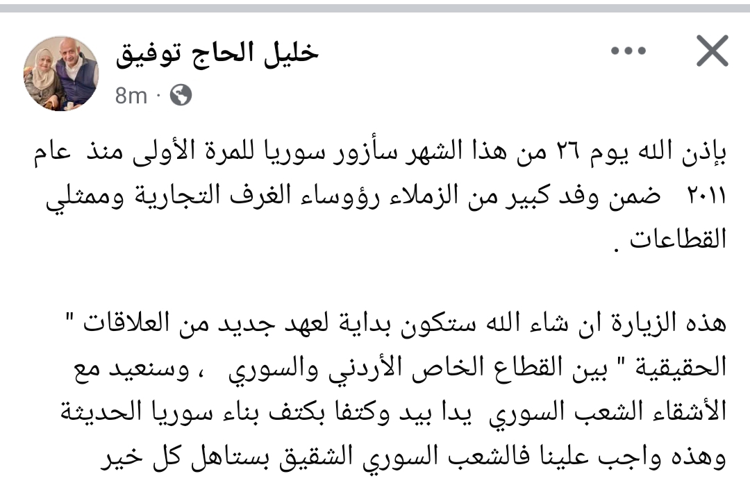 أعلن رئيس غرفة تجارة الأردن، خليل الحاج توفيق، عن زيارة مرتقبة إلى سوريا في السادس والعشرين من الشهر الجاري، هي الأولى له منذ عام 2011، وذلك ضمن وفد كبير يضم رؤساء الغرف التجارية وممثلي القطاعات الاقتصادية الأردنية. وقال الحاج توفيق في تصريح له: "بإذن الله يوم 26 من هذا الشهر سأزور سوريا للمرة الأولى منذ عام 2011، ضمن وفد كبير من الزملاء رؤساء الغرف التجارية وممثلي القطاعات"، مضيفاً أن هذه الزيارة "ستكون بداية لعهد جديد من العلاقات الحقيقية بين القطاع الخاص الأردني والسوري". وأكد رئيس غرفة تجارة الأردن أن هذه الخطوة تأتي في إطار تعزيز التعاون الاقتصادي بين البلدين، مشيراً إلى أن "إعادة بناء سوريا الحديثة ستكون يداً بيد وكتفاً بكتف مع الأشقاء في الشعب السوري، وهذا واجب علينا، فالشعب السوري الشقيق يستحق كل الخير".