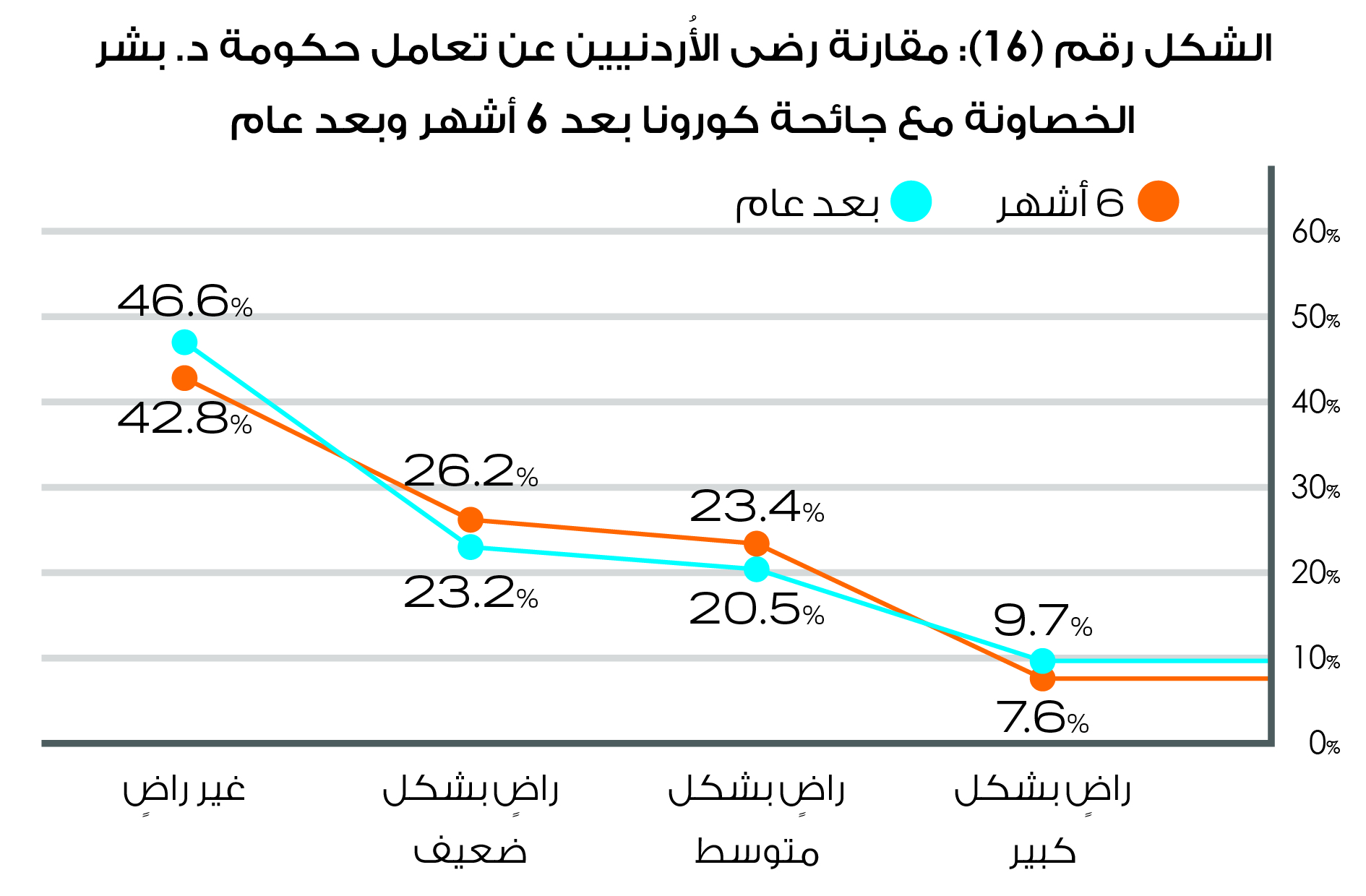 وبينت النتائج أن 9,7% من الأردنيين راضون بشكل كبير عن تعامل الحكومة مع جائحة كورونا، 43,7% راضون بشكل متوسط وضعيف، فيما بلغت نسبة الأردنيين غير الراضون عن تعامل الحكومة مع جائحة كورنا وتداعياتها خلال عامه الأول 46,6%.