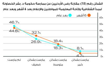 وأظهرت نتائج الاستطلاع أن 8,1%من الأردنيين يرون أن الحكومة كانت شفافة في إتاحة المعلومة للمواطنين والإعلام بعد عام، بينما يرى 45,2%أن الحكومة مارستها بشكل متوسط وضعيف، فيما يرى 46,7%من الأردنيين أن الحكومة لم تمارس مبدأ الشفافية وإتاحة المعلومة.