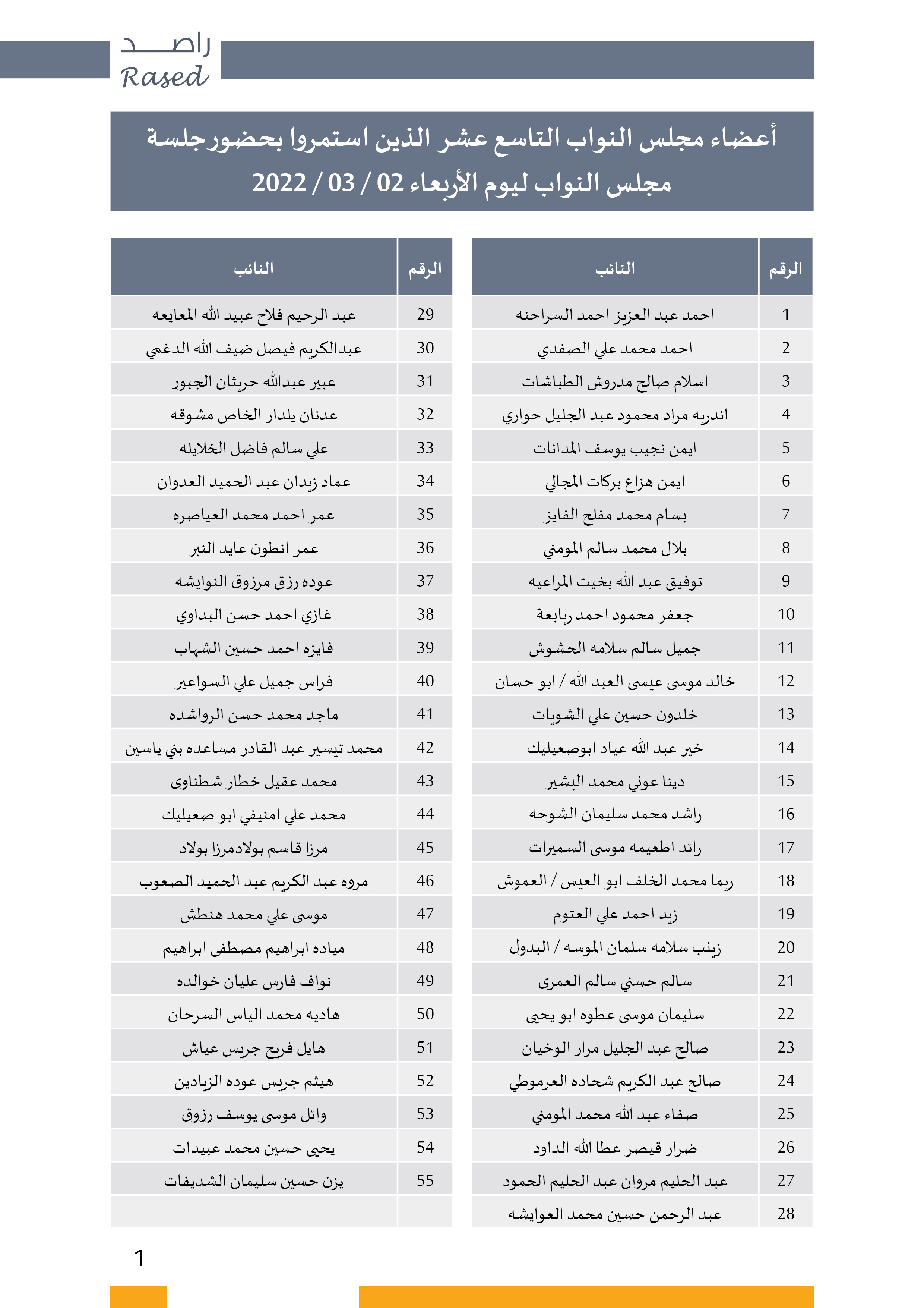 وينشر راصد أسماء البرلمانيين والبرلمانيات الذي استمروا في الجلسة التي عقدت اليوم الأربعاء الموافق ٢ – ٣ -٢٠٢٢ وأسماء النواب الذين لم يستمروا بحضور الجلسة وأسماء النواب المتغيبين بعذر وأسماء النواب المتغيبين بدون عذر من خلال الجداول المرفقة.