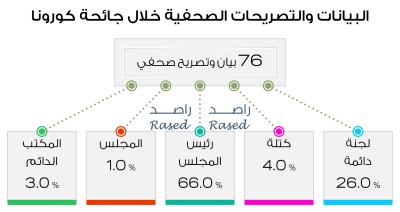 وعلى صعيدٍ متصل تتبع فريق إعداد التقرير البيانات والتصريحات الصحفية التي صدرت خلال فترة الجائحة حيث تبين أن عددها وصل إلى 76تصريح وبيان، 66%منها صدروا من رئيس مجلس النواب 26%منها صدروا من اللجان النيابية الدائمة و4%من الكتل البرلمانية و3%من المكتب الدائم لمجلس النواب و1%من المجلس.