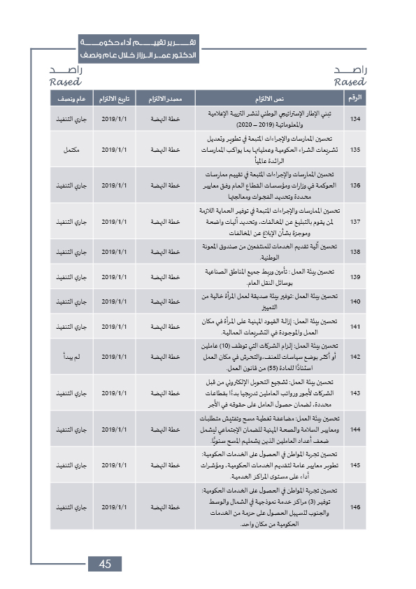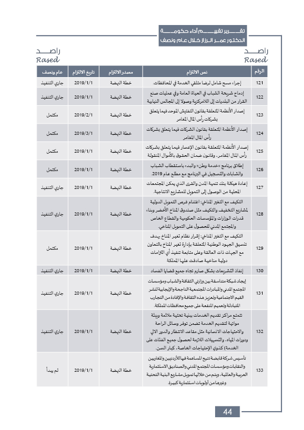 راصد:301 التزام التزمت بها حكومة الرزاز خلال عام ونصف اكتمل منها 18% و68% منها جاري العمل عليها