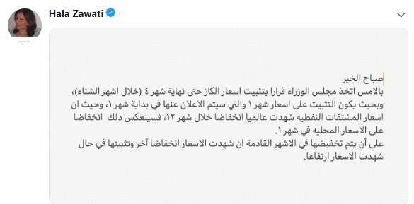 وأكدت زواتي في تغرديتها على قرار الوزراء أمس بتثبيت أسعار الكاز حتى نهاية شهر نيسان المقبل، بحيث يكون التثبيت على أسعار شهر كانون الثاني.