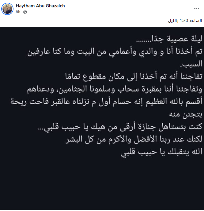 وقال هيثم أبو غزالة في منشور عبر /فيسبوك/، "ليلة عصيبة جدا، تم أخذنا أنا و والدي وأعمامي من البيت ولم نكن نعرف السبب".