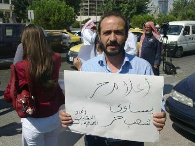 ورفع اصحاب المواقع في الاعتصام يافطات تحمل "لا اصلاح بدون حرية الاعلام ، لا لحجب المواقع الالكترونية ، اعلام حر يساوي شعب حر ، لا لسياسة تكميم الافواه ".
