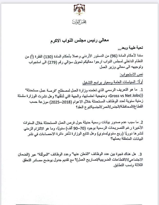 وكانت جلسة النواب قد شهدت جدلاً واسعًا عقب رد وزير العمل خالد البكار، والذي وُصف من قبل بعض النواب بـ"القاسي والمسيء"، ما دفع النائب طهبوب إلى اتخاذ خطوة التصعيد الرقابي.