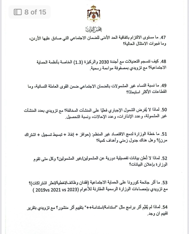 في أطول استجواب يشهده مجلس النواب الأردني، قدّمت النائب ديمة طهبوب استجواباً مكوّناً من 100 سؤال استجوابي موجّه لوزارة العمل، حول تطبيق معايير العمل اللائق في الأردن.