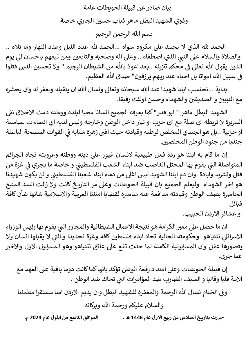 أصدرت عشيرة الحويطات، الاثنين، بيانا علقت فيها على العملية التي نفذها الشهيد ماهر الجازي الحويطات في معبر الكرامة في غور الأردن، وأدت إلى مصرع 3 من جنود الاحتلال.