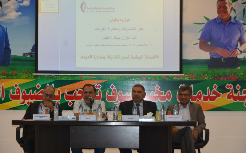 من ضمن فعاليات حملته الوطنية الرامية "حفز المشاركة ومغادرة العزوف"، نظّم مركز القدس للدراسات السياسية جلسة حواريةً في لجنة تحسين خدمات مخيم سوف بمحافظة جرش تحت عنوان: "أنت القرار...وبيدك الاختيار" بمشاركة حوالي 70 ناشطاً وناشطة من قادة وكوادر الأحزاب السياسية وفعّاليات المجتمع المحلي ونواب سابقين لمنطقة سوف. وتحدث في الحوارية كل من الأستاذ سلمان نقرش الأمين العام للحزب الديمقراطي الاجتماعي والمهندس عدنان السواعير المفوض العام للحزب المدني الديمقراطي-قيد التأسيس.