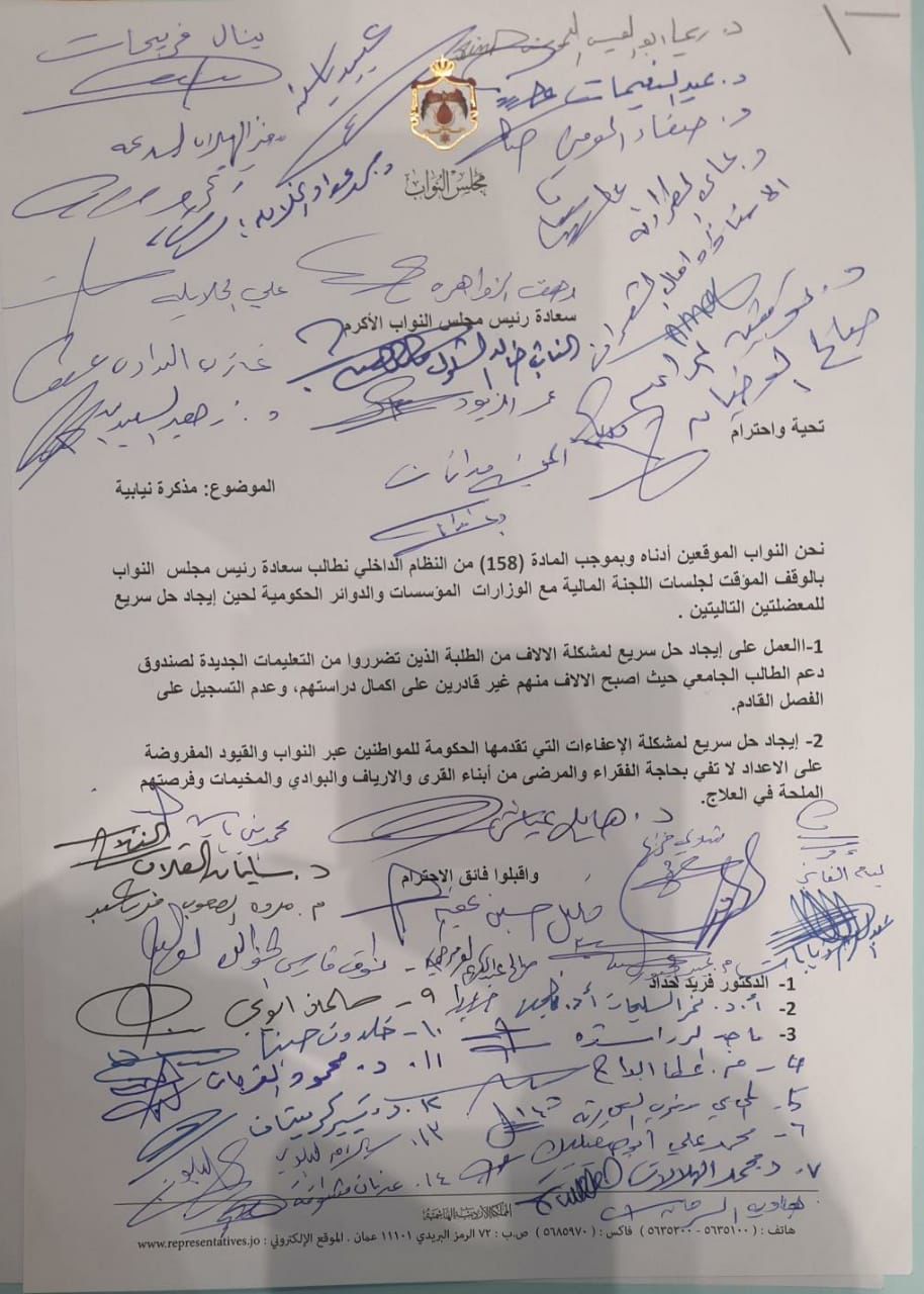 ودعا النواب إلى العمل على إيجاد حل سريع لمشكلة الآلاف من الطلبة الذين تضرروا من التعليمات الجديدة لصندوق دعم الطالب الجامعي، موضحين أن أغلب الطلاب أصبحوا غير قادرين على إكمال دراستهم وعدم التسجيل على الفصل المقبل.
