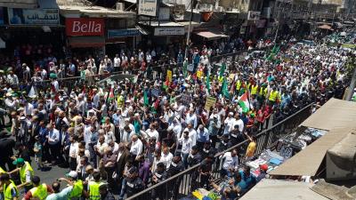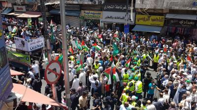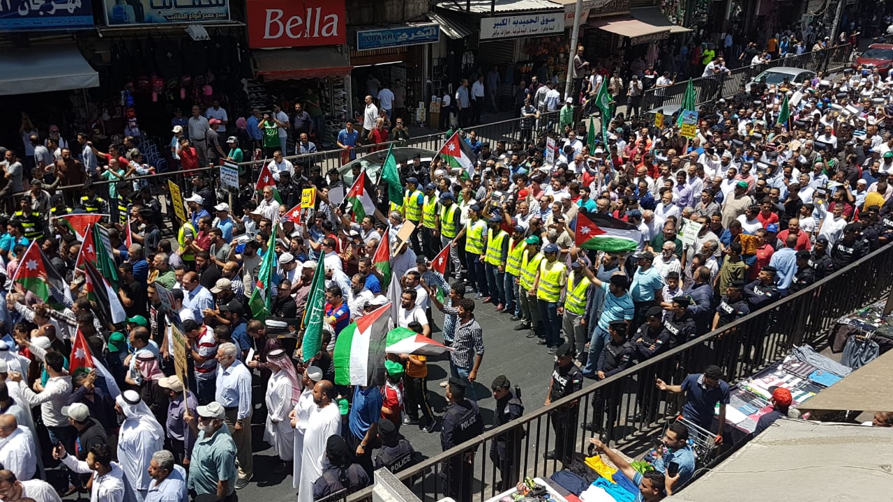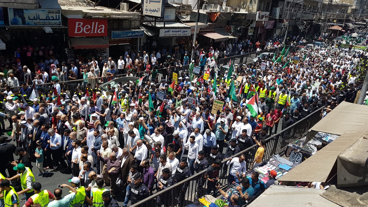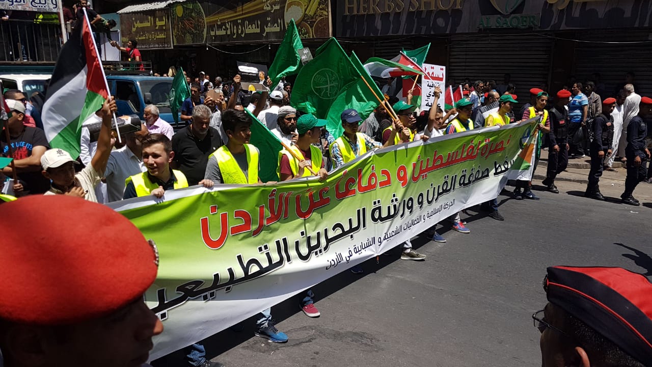 وحملت المسيرة عنوان "لا للتطبيع وبيع الأوطان" بتنظيم من الحركة الإسلامية وفعاليات شعبية ، وهتف المحتجون رافعين صورا للقدس وأعلام فلسطين "تسقط وادي عربة"، "بالروح بالدم نفديك يا أقصى"،"لن نخضع للأمريكان".."شعب الأردن وفلسطين برفض صفقة البحرين".. "عمر الأردن ما بنسى أنه وصي على الأقصى" في اشارة الى الوصاية الهاشمية على المقدسات.