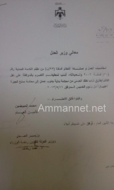 أكد الناطق باسم معتصمي وزارة العدل محمد الخوالدة تسلم بعض موظفي وزارة العدل المضربين قراراً بنقلهم عن العمل من وزارة العدل في العاصمة إلى محافظات أخرى.