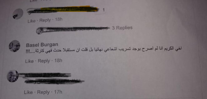 وأرفقت اللجنة صورة تعليق للناشط برقان يؤكد فيه أنه لم يتحدث عن وجود تسريب اشعاعي نهائيا، بل قال "إن حدوث تسرب اشعاعي سيكون كارثة"، كما أرفقت صورة تؤكد أن التصريحات انحصرت بالتحذير من "وجود أخطاء وخروق في المفاعل تؤدي إلى تسريب اشعاعات".