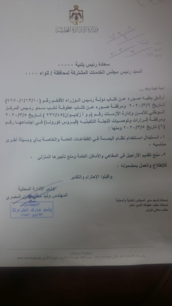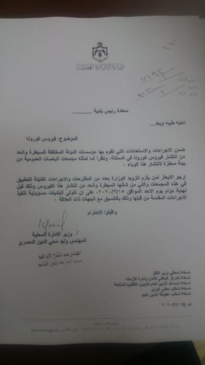 حيث وجه لرؤساء البلديات ومجالس الخدمات المشتركة بناء على كتاب نائب سمو رئيس المركز الوطني للامن وادارة الازمات وقرارات وتوصيات اللجنة التنفيذية ( فيروس كورونا) في اجتماعها الاخير للاطلاع والعمل بمضمون الكتاب.