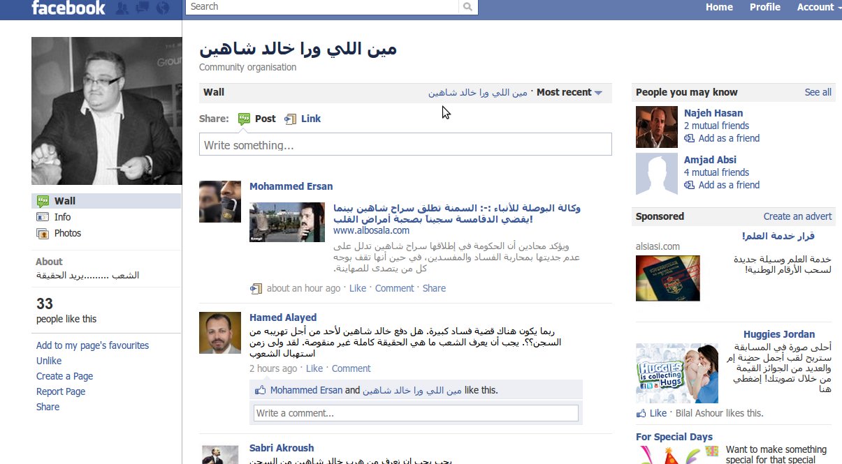 اطلق مجموعة من الشباب صفحة على موقع التواصل الاجتماعي ” فيس بوك” بعنوان ” من يلي ورا خالد شاهين” مطالبين بمعرفة الحقيقة الكاملة وراء السماح له بالسفر الى الخارج للعلاج.