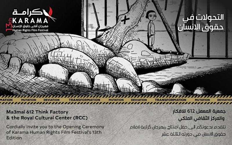 تحت عنوان "التحولات في حقوق الإنسان"، تنطلق الدورة الثالثة عشرة من "مهرجان كرامة لأفلام حقوق الإنسان"، مساء الخميس المقبل (15/12/2022) في المركز الثقافي الملكي بعمان.