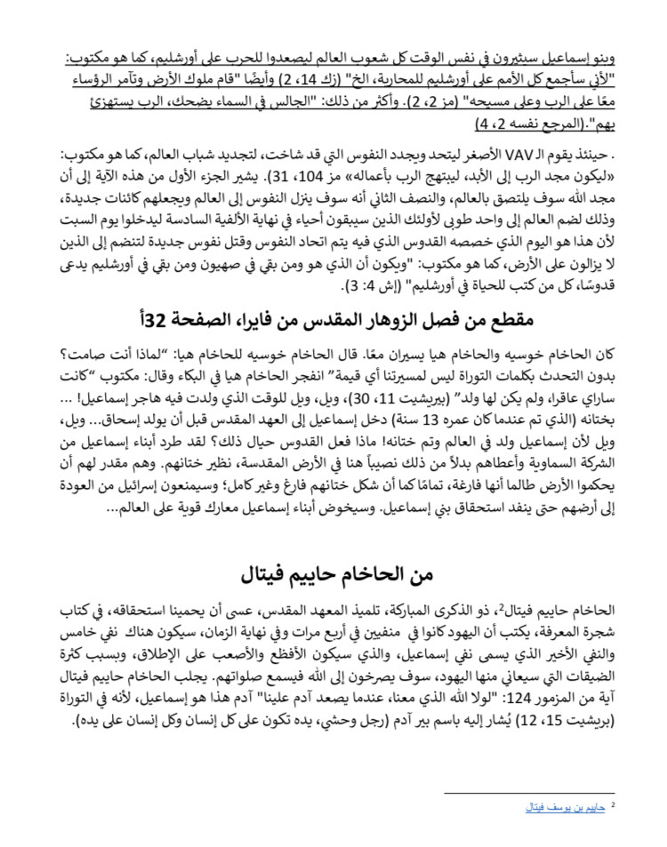 إن هذه النبؤات وغيرها وردت في كثير من النصوص الدينية التي يدرسها هؤلاء المتطرفون من حاخامات وسياسيين وجماهير ومن أبرزها كتاب "نهاية الأزمنة والفداء القادم " الذي جمع نبؤات متعددة من حاخامات يهود من القرن العاشر والسادس عشر الميلادي، مثل شمعون بار يوشاي وحاييم بن يوسف فيتال، نبؤات تم تفسيرها بناء على الطرح الصهيوني الديني، حيث تتحدث هذه النبؤات عن حرب كبرى تقوم بين "إبنة يعقوب " و"أبناء إسماعيل" تأخذ شكل التهديد الوجودي للكيان العبري، وبالتالي يجب على القائمين على قيادة الشعب العمل على تأجيجها، لأنه و في خضم هذه المعارك سوف يأتي المسيا وعند قدومه سوف يتجمع أبناء إسماعيل "العرب والمسلمين" على شعب الله المختار، ولكن الرب سوف ينفذ كلام حيث سيأتي "الرب" ويقوم بتخليص شعبه ومسيحه، وهذا يؤكد أن بنيامين نتنياهو -الذي قطع وعداً للحاخام شنيرسون بأن يعمل لإظهار المسيا- يقود نظاماً يستند في سياساته على فلسفة دينية بالتحالف مع رجال دين متطرفين يشرعنون الحركة الصهيونية ويجعلون لهذه الأيدلوجية "علمانية الأصل" صفة القداسة، وتمنح قادتها الحاليين حصانة شبه إلهية مسيانية.