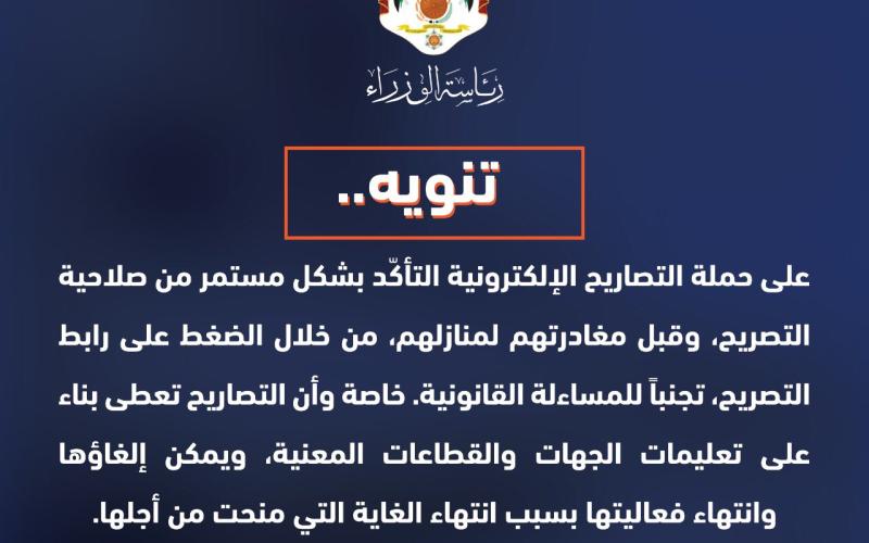 قالت رئاسة الوزراء ، ان على حملة التصاريح الإلكترونية التأكد بشكل مستمر من صلاحية التصريح وقبل مغادرتهم لمنازلهم من خلال الضغط على رابط التصريح تجنباً للمساءلة القانونية. خاصة وأن التصاريح تعطى بناء على تعليمات الجهات والقطاعات المعنية ويمكن إلغاؤها وانتهاء فعاليتها بسبب انتهاء الغاية التي منحت من أجلها.