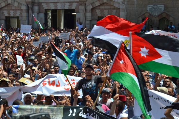 كما رفعوا الأعلام المصرية والأردنية إضافة إلى يافطات كتب عليها: "اثبت يا ريس خليك حديد".. "يسقط يسقط حكم العسكر في كل مكان".. لا للانقلاب على الشرعية نعم لحرية الشعوب"...